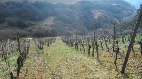 In den Weinberger stand plötzlich ein Pavillon mit dem obigen Schild. Die Einladung zur kostenlosen Probe ließen sich die durstigen Kehlen natürlich nicht entgehen und Ruck-Zuck war die Kühlbox offen und die Gläser waren voll. Der Winzer kam später vorbei und meint, ist okay. Jetzt ging es noch einmal um den Berg und dann konnte wir auf Remich und die Mosel runter schauen. |