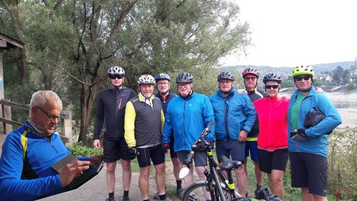 Wir kamen ohne Karte aus, denn die Radwege waren optimal beschildert und führten uns stets abseits der Hauptstraßen an Weingütern, Höfen und Spargelfeldern vorbei. Wie immer haben wir die Strecke spontan während der Fahrt festgelegt. Sie führte uns letztlich über Kreuznach, Wöllstein, Wörrstadt und Nieder-Olm nach Ingelheim. Dann am Rhein vorbei nach Bingen und von dort über den Naheradweg zurück. Nur beim Mittagsessen (gut !!) im Sportheim Nieder-Olm regnete es. |