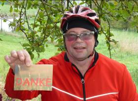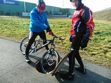 Als wir auf dem Radweg an der B 41 unterwegs sind, hat vermutlich ein Fahrradhasser einen Gullideckel entfernt. Edgar und ich vorne bemerkten es rechtzeitig und konnten ausweichen. Allerdings hat Mario hinter uns das Loch zu spät gesehen und fuhr mit dem Vorderrad hinein. Weil wir schon bremsten und warnten, war er nicht mehr so schnell und stürzte nicht. Wäre jemand ungebremst in das Loch geraten, wäre ein Überschlag wohl unvermeidbar gewesen. Wir haben den Deckel von der Wiese geholt und wieder einsetzt — Idioten gibt‘s !! |