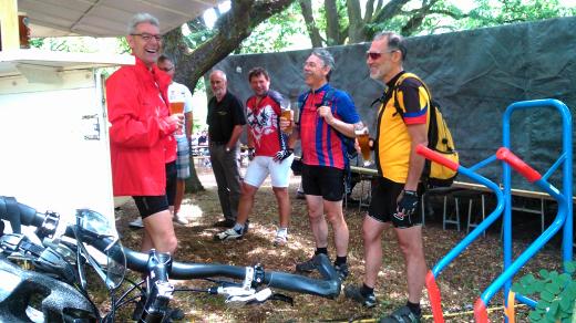 19.7.2015 Nur zu Zweit unterwegs —die anderen sind verhindert. Mario und ich fuhren aufwärts oberhalb von Spabrücken in den Wald. Auf den Waldwegen im ehemaligen Muni-Depot haben wir uns dann etwas verfranzt und sind einige Runden gefahren. Trotzdem haben wir später den Bierstand auf unserem Waldfest gefunden. Dort waren wir auch nicht lange alleine, denn wie jedes Jahr, Kam auch die Radlertruppe aus dem Nachbarort Sommerloch auf ein Bier vorbei.